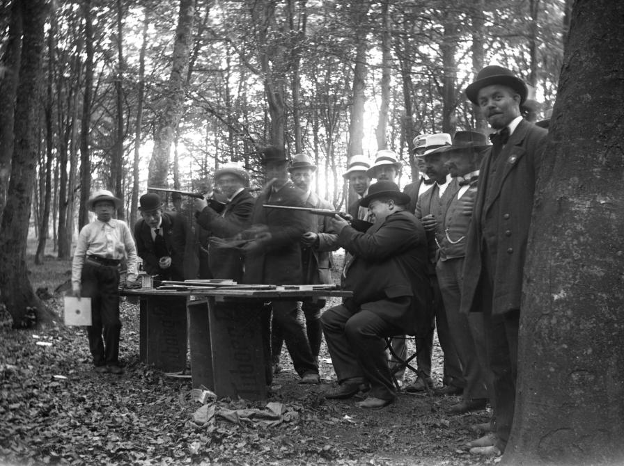 Carl Kern-Hansen har optaget flere fotografier fra fugleskydningsselskabets arrangementer. Selskabet blev etableret i 1899, og i starten havde man skydeplads ved Holmegården i Hillerød Øst. Senere flyttede man til Tyvekrogen, der lå for enden af Elmegårds Alle, hvor skydebanen lå i flere årtier frem til 1946. Da Elmegårdskvarteret i 1960’erne blev udstykket til boliger, hed den sidste vej i området Tyvekrogen, men folk ville ikke bo på en vej med det navn, så vejen blev omdøbt til Løvspringet.